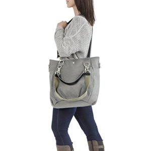 Stroller straps, a changing pad and bottle holder are also included. The rolled faux leather straps are very comfortable to carry on your arm, and you can also carry the bag with the removable cross-shoulder strap.